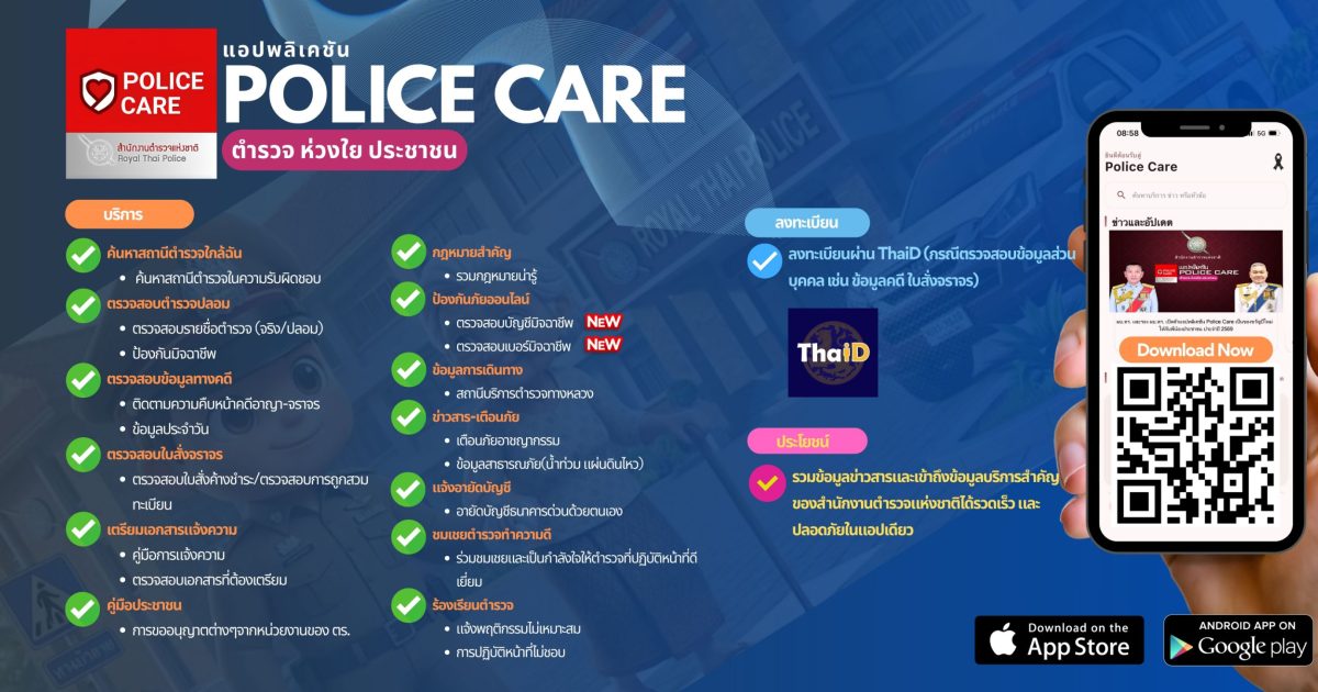 สำนักงานตำรวจแห่งชาติได้พัฒนาเครื่องมือสื่อสารที่จะเปลี่ยนภาพลักษณ์การแจ้งเหตุแบบเดิม ๆ ให้เข้าถึงง่าย รวดเร็ว และแม่นยำยิ่งขึ้นผ่านแอปพลิเคชัน “Police Care” นวัตกรรมที่สะท้อนถึงความมุ่งมั่นว่า “ตำรวจพร้อมดูแลและห่วงใยประชาชนทุกคน”