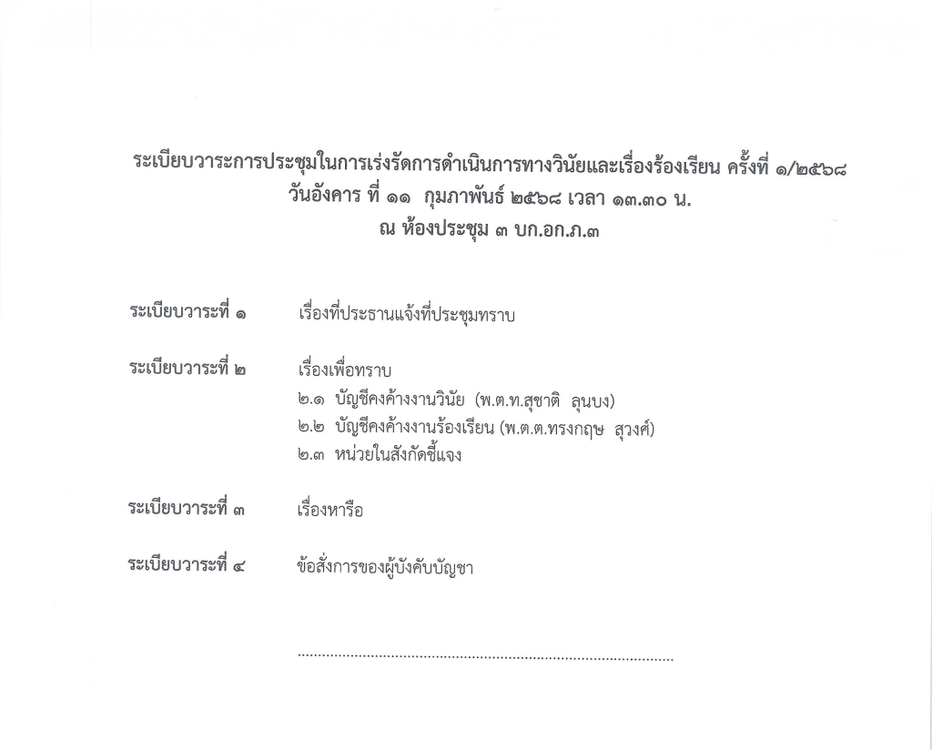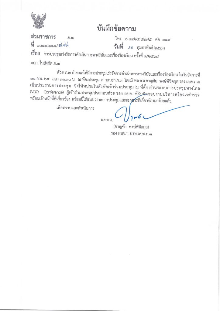 วันที่ 11 กุมภาพันธ์ 2568 เวลา 13.30 น. พล.ต.ต.ชาญชัย พงษ์พิชิตกุล รอง ผบช.ฯ ปรท.ผบช.ภ.3 เรียกข้าราชการตำรวจในสังกัด ประชุมเร่งรัดการดำเนนิการทางวินัยและเรื่องร้องเรียน ณ ห้องประชุม 3 บก.อก.ภ.3